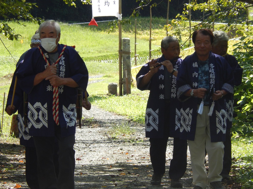 令和5年9月15日(木)、多岐神社(吉内)にて例大祭本祭りが厳かに執り行われました。 管理関係者による玉串奉納につづいて橘内神楽が奉納され、神の恵みに感謝と五穀豊穣・地域の安全・災厄退散を祈願しました。
