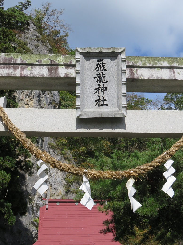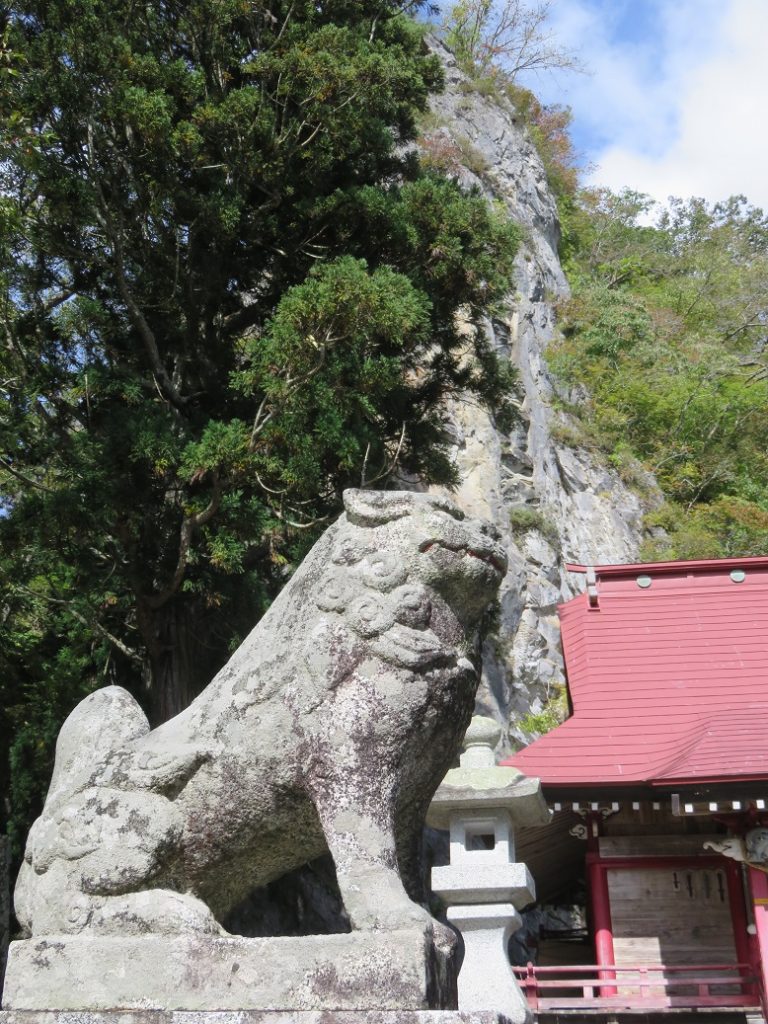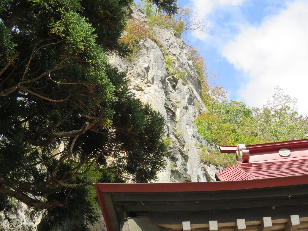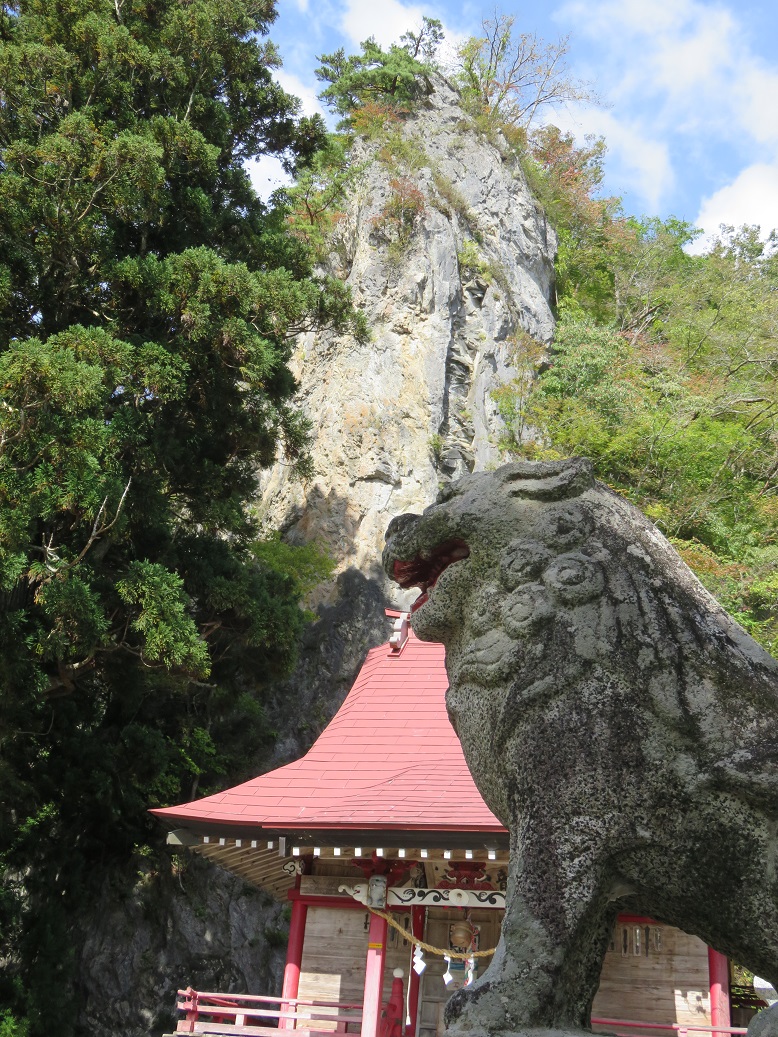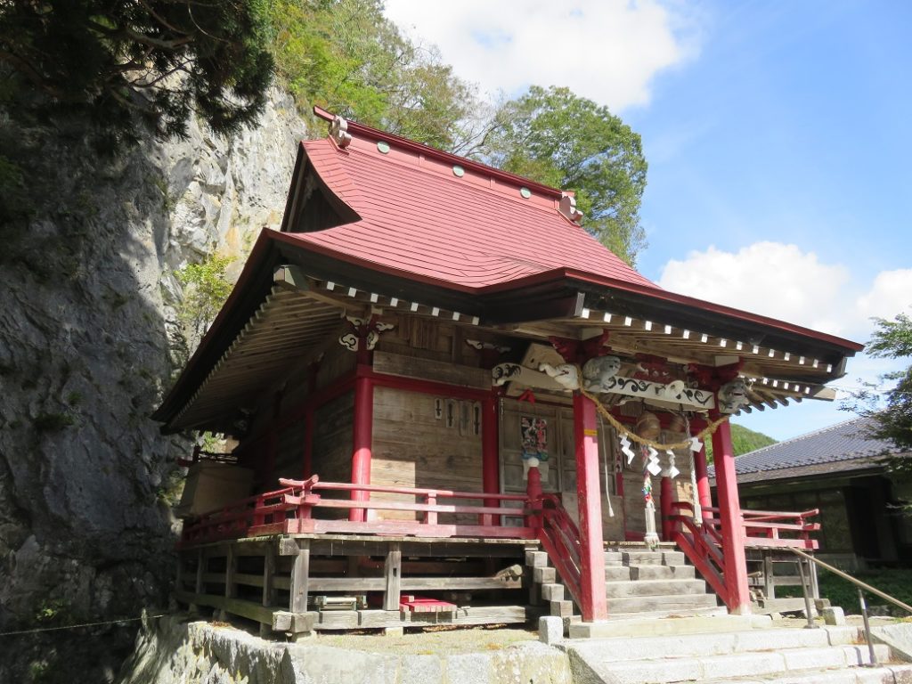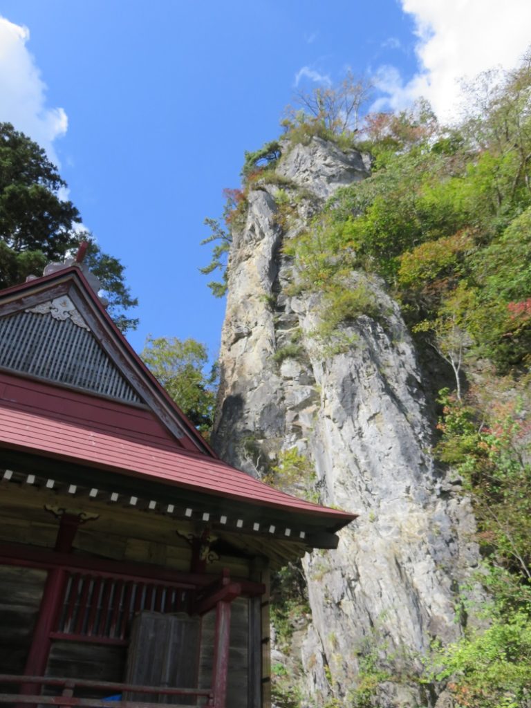 巌龍神社は、小友川に架かる不動橋を渡った北岸にあり、本殿の背後にそびえる不動岩の高さは約54m。10階建てのビルに相当する。