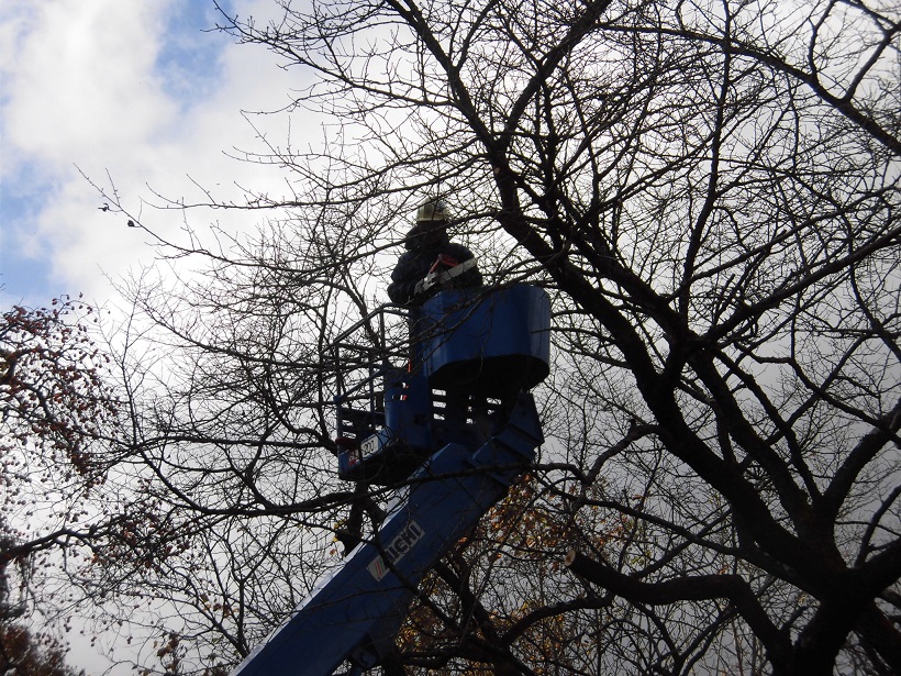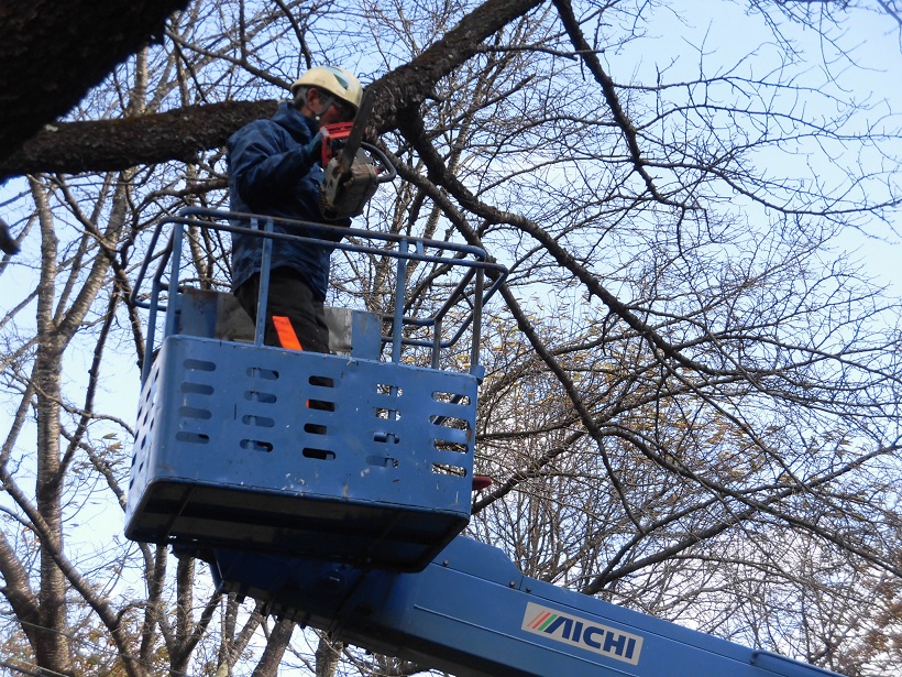 道路に大きくはみ出した枝を高所作業車を使って切り落としたり、雑木をチェ-ンソ-で切り倒す等、大掛かりな作業となりました。