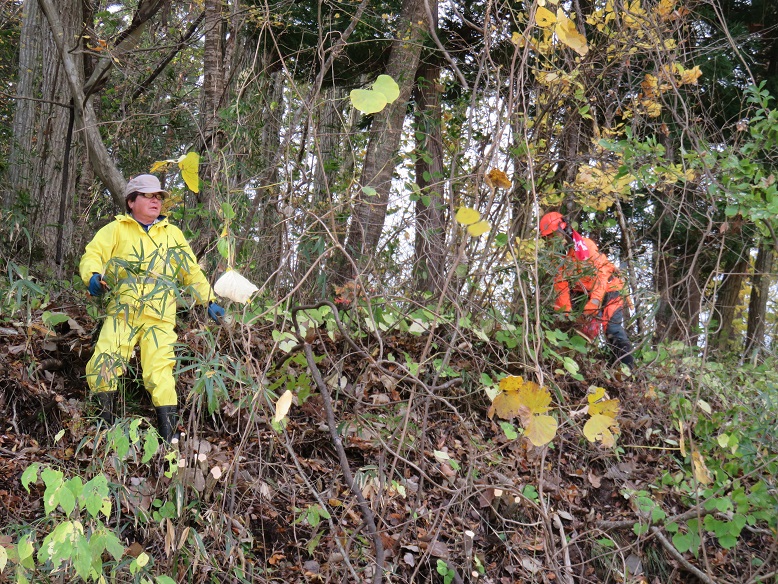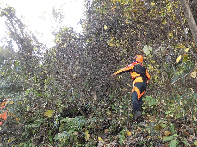 斜面の雑木伐採は、足場が悪くまた枝が複雑に絡まっていたりして、特にチェ-ンソ-担当の皆さんにはよりご苦労を掛けました。