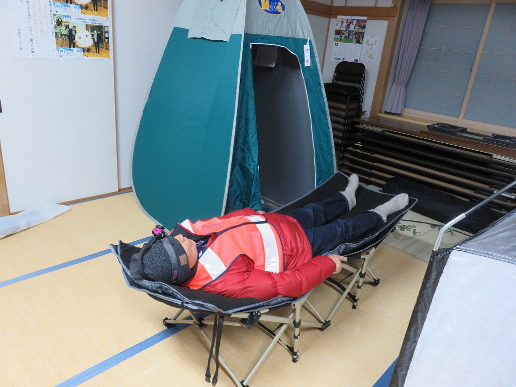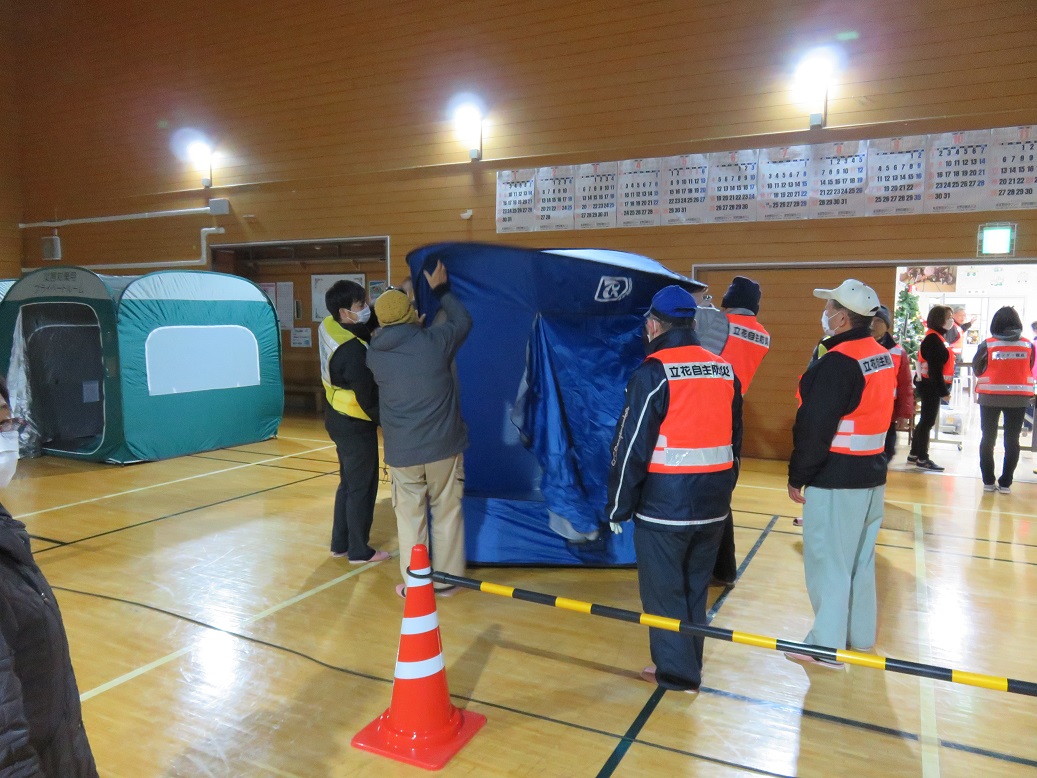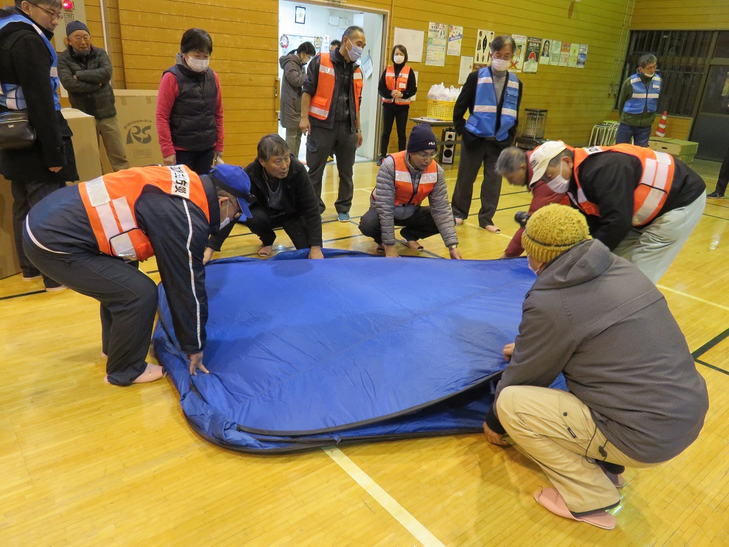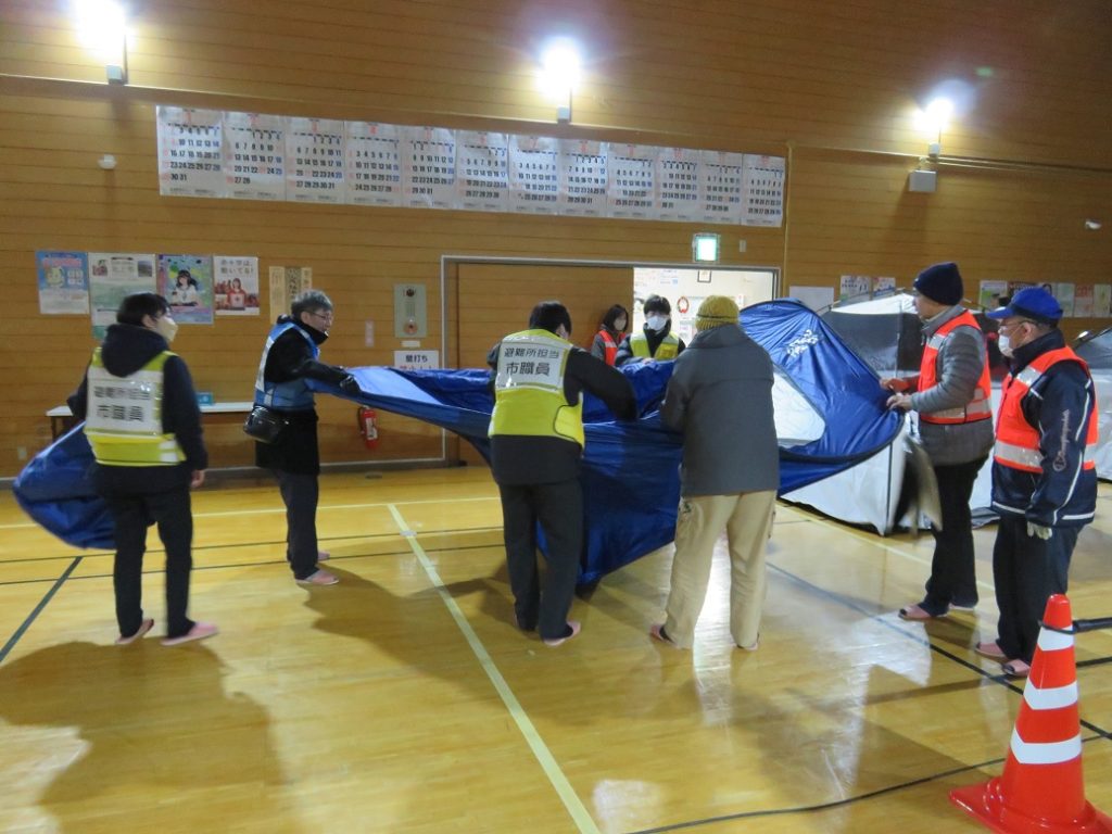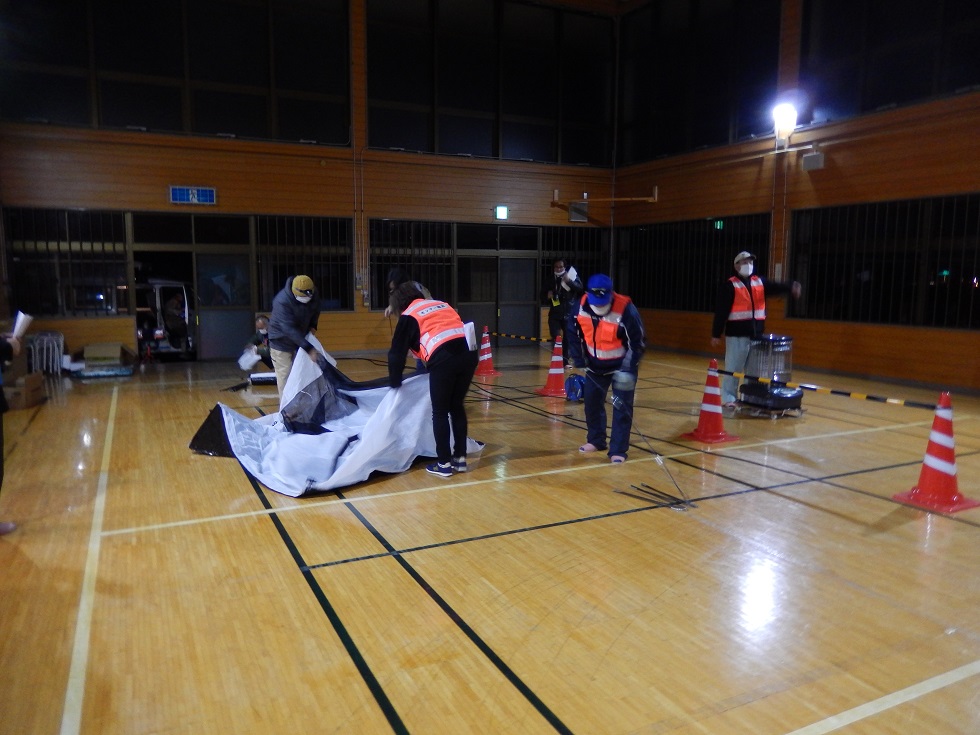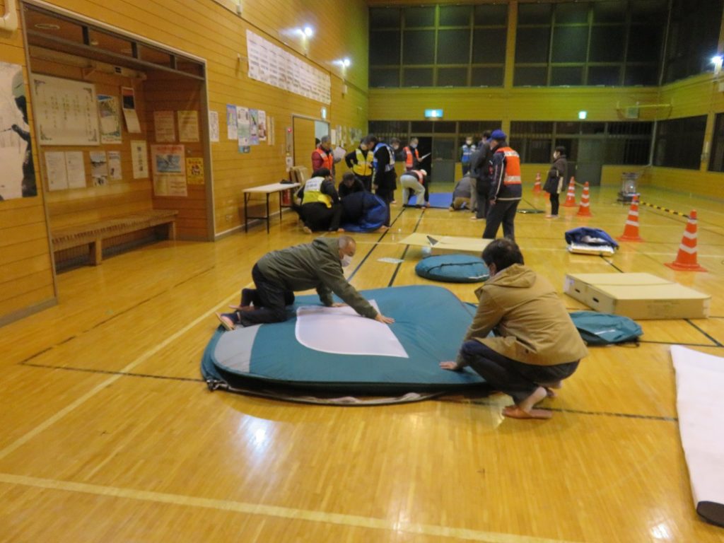 前回までの訓練で浮かび上がった問題点等の改善状況の確認と、新規に配備された避難所備品の組立訓練を実施しました。