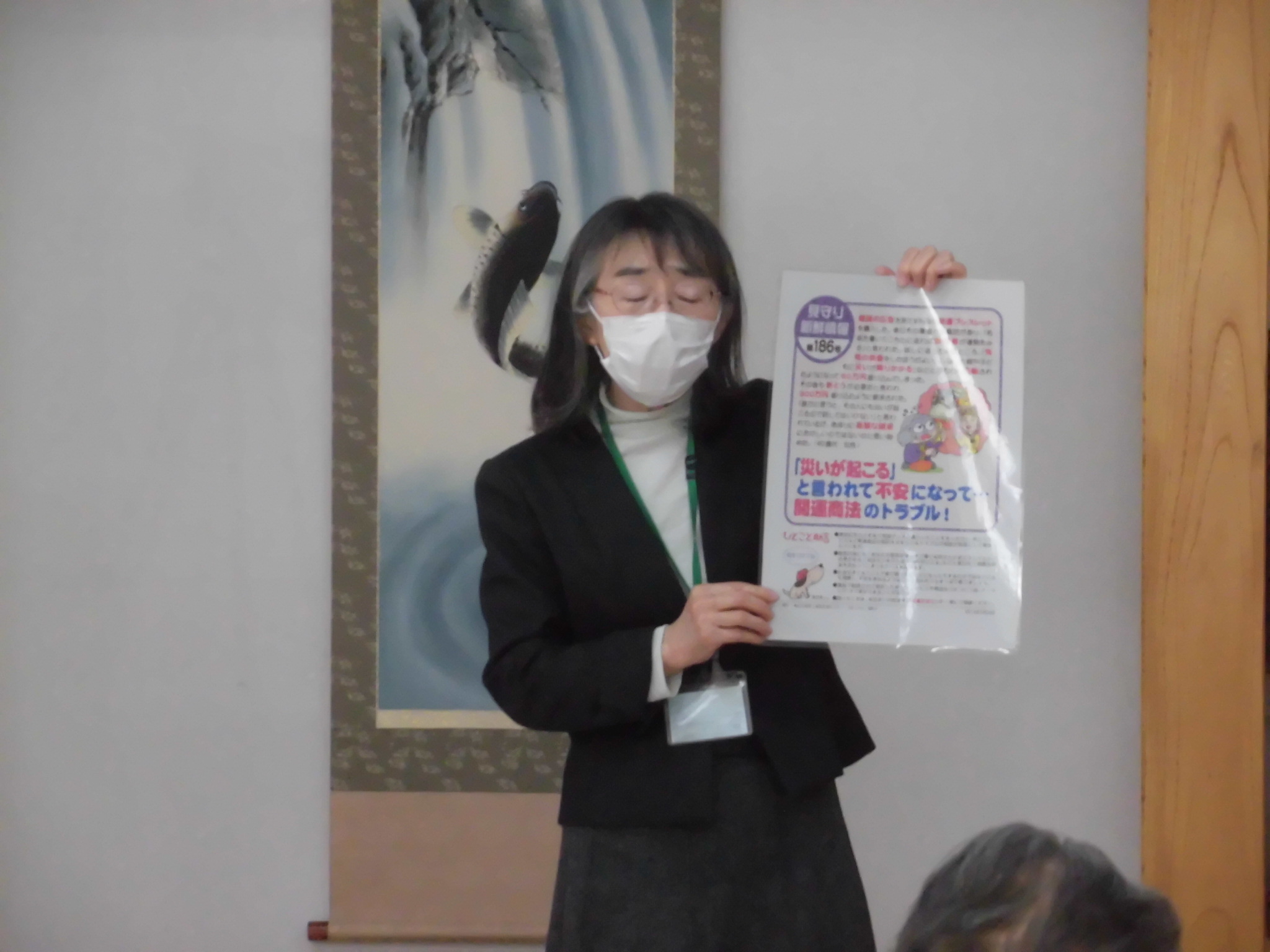 5月30日(水)、出前講座を利用し北上市消費者生活センターから佐藤美智子氏をお招きし消費者トラブルについてお話していただきました。(参加者15名)