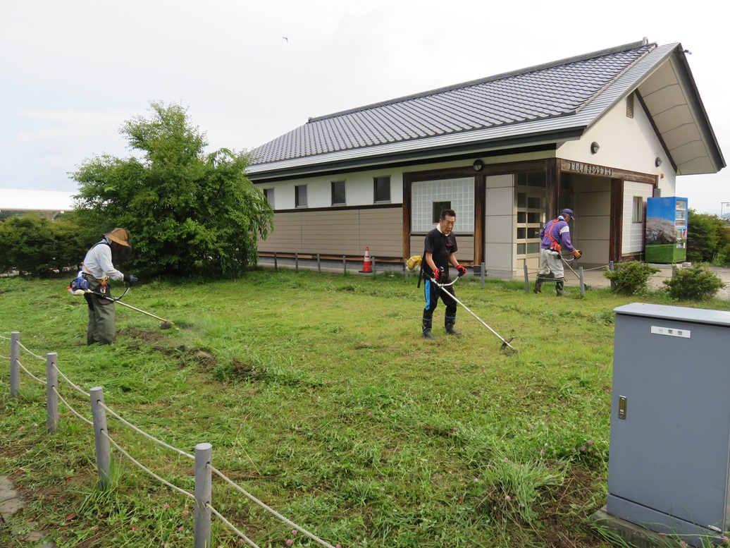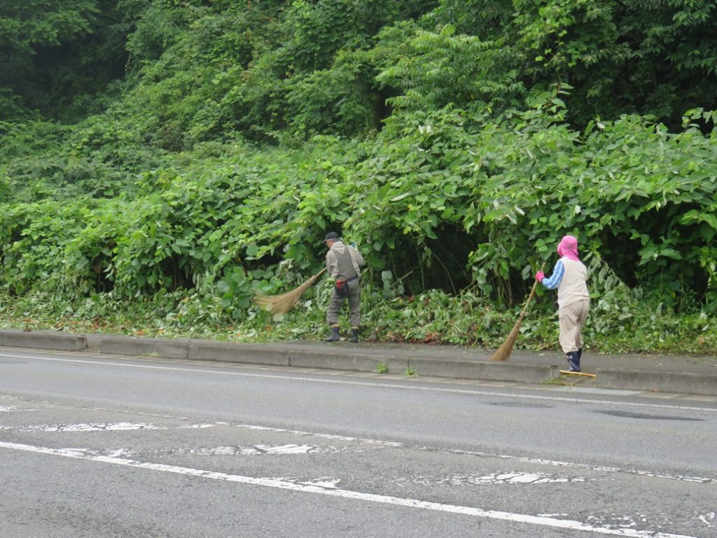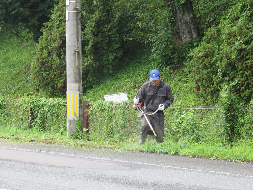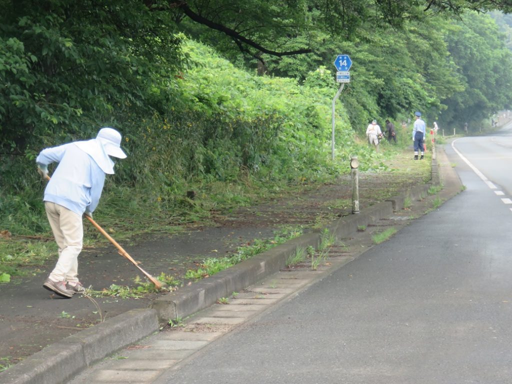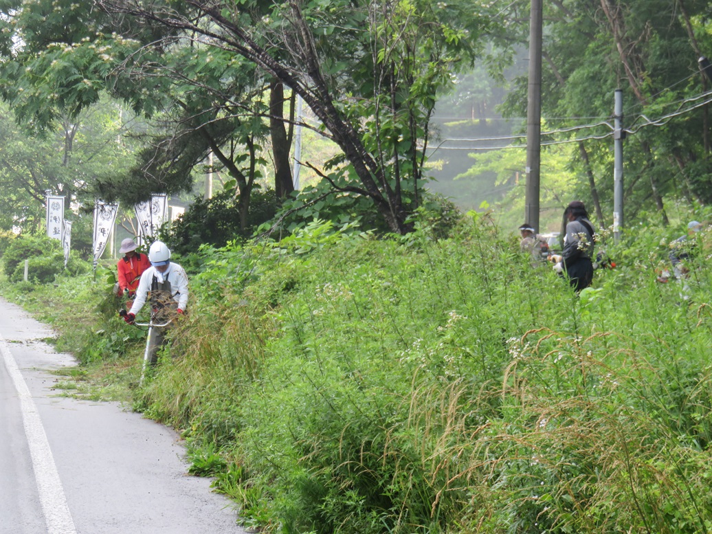 今回は、北交差点付近とさわやかトイレ周辺の2カ所の他にサトウハチロー記念館周囲も追加しての作業としましたので、草刈り後の掃除や草よせの人員が足りなかった。次回以降は人員確保に呼びかけ他考慮することとしたい。県道を通るドライバ-、ウォ-キング愛好者、展勝地を訪れる皆さんなどに、気持ちよく迎えられることと思います。